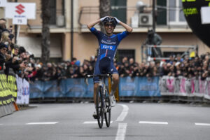 Il vantaggio è arrivato a sfiorare i quattro minuti, ma la testa del gruppo li ha raggiunti grazie al forcing dell’UAE Emirates. Nel circuito finale, con l’impegnativa salita di Colla Micheri da ripetersi quattro volte, ad attaccare per primo è stato Benoit Cosnefroy (AG2R), seguito da Lorenzo Rota (Intermarché) e da Alessandro Covi, che poi scivola in discesa. Si forma in testa un drappello ormai ridotto a otto unità, per andare ad affrontare la seconda scalata con Nans Peters, altro atleta AG2R, che tenta l’affondo e non viene più raggiunto, gestendo lo sforzo e arrivando al traguardo a braccia alzate.